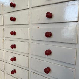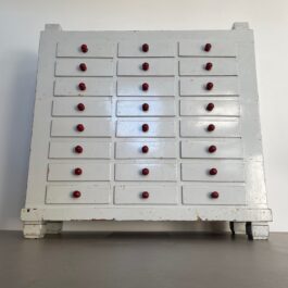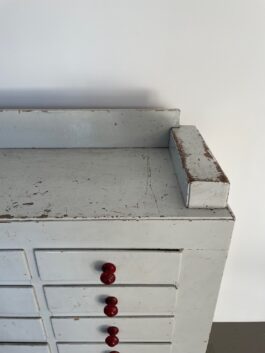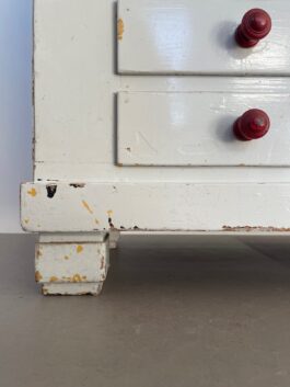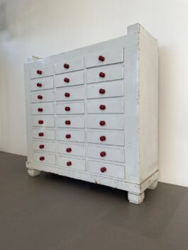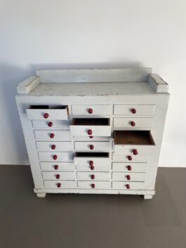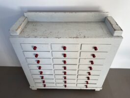Een karakteristieke houten ladekast naar schatting afkomstig uit eind jaren 40, begin jaren 50.