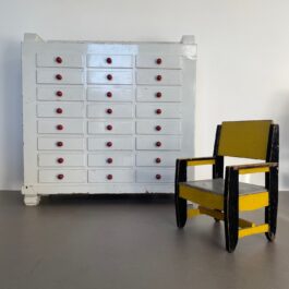 De ladekast / schoolkast doet modernistisch aan, mede door de hoekige vormgeving en de primaire kleurstelling.