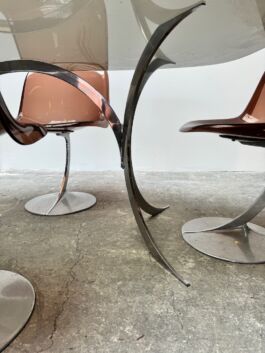 Het metalen tafelonderstel is zwaar verchroomd, de stoelpoten van metaal en gegoten aluminium met daarop een transparante mocca-bruine kunststof kuip. Ronde sierkussentjes zouden de set eventueel compleet maken.