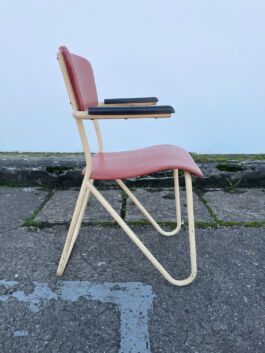 Met een crème gelakte buis, de originele genagelde zachtrode vinyl bekleding en bakelieten armleggers.