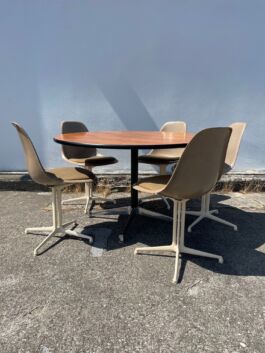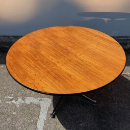 De zwaar verchroomde sterpoot maakt het uitermate geschikt om de onderstellen van de Eames stoelen aan de tafel te schikken en de gladde toplaag van het blad is zeer praktisch met afnemen. Vanaf de jaren 60 werd de tafel ook aangeboden met een houten gefineerde top, zoals deze aangeboden variant in walnotenhout.