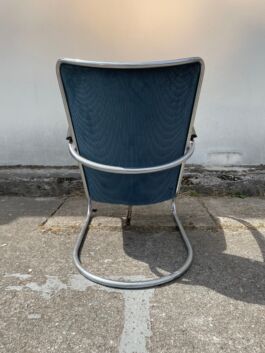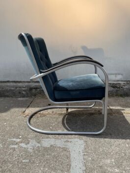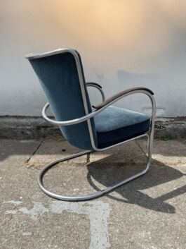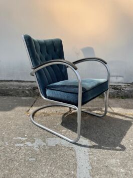 Dè iconische en uiterst comfortabele herenfauteuil van Gispen, het ontwerp komt uit vroeg jaren 30 en deze stoel dateert naar zeggen van de eerste eigenaar uit eind jaren 40, wellicht begin jaren '50. Vanaf midden jaren '50 waren de afwerkingspunten namelijk anders; bij dit model hangt de gecapitonneerde rug nog in het frame, geen zichtbare schroeven en een los zitkussen. De stoel is zo'n 10 jaar geleden vakkundig opnieuw gestoffeerd met de originele Gispen Manchester stof kleur petrol en verkeert nog in prima staat.
