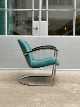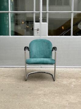 Een jaren 30 Gispen 414 "dames-"fauteuiltje opnieuw gestoffeerd met de hoogwaardige Cordova ribcord in een prachtige kleur aquamarijn.