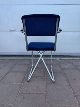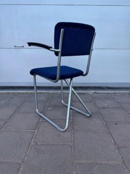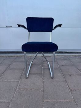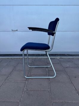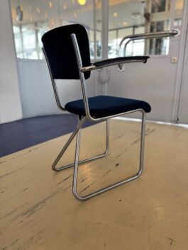 Een fraai sledemodel Gispen eetkamerstoel uit begin jaren 50 met vernikkeld frame, blinde sluiting en bakelieten armleggers.