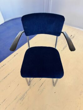 De stoel is hergestoffeerd in koningsblauw Cordova ribcord en kan weer een leven lang mee.