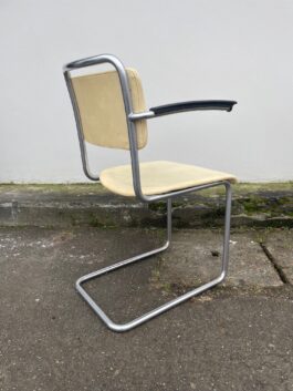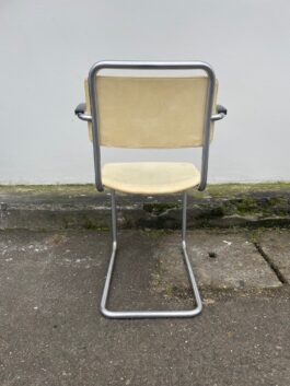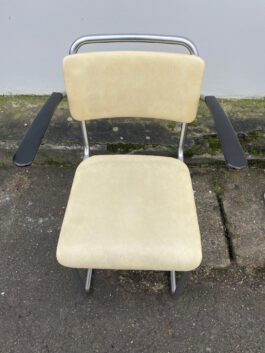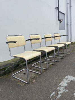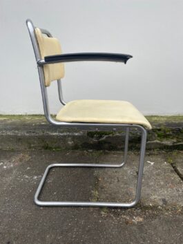 Een mooie set van 4 jaren 50 Gispen 201 stoelen met de doorlopende buis boven de rug en de bakelieten armleggers, met vrij bijzonder; de originele crème-wit skai bekleding volledig intact.