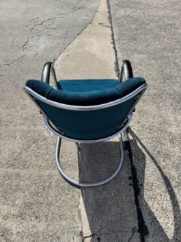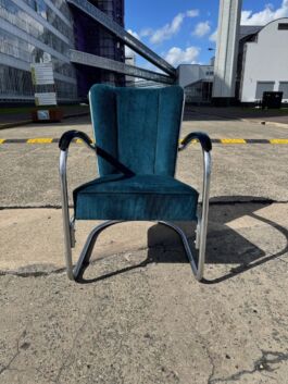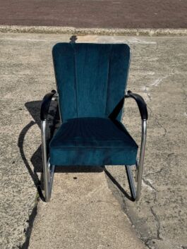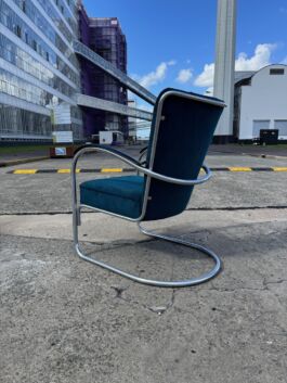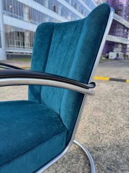 Uiteraard nog nieuw te bestellen, echter dit betreft een originele, waardevaste jaren 50 variant. Zowel de vernikkelde buis als de bakelieten armleggers verkeren in mooie staat, de fauteuil is hergestoffeerd met petrol ribcord.