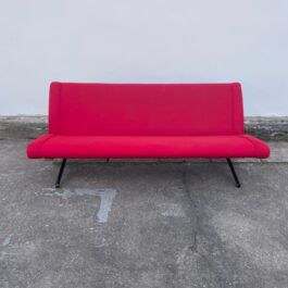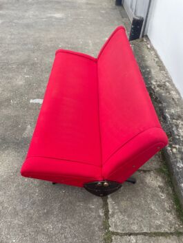 De jaren 60 bank is gestoffeerd met de originele dieprode Lana Diagonale kwaliteitsstof en verkeert in goede staat.
