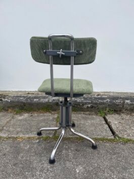 Deze burostoel / schrijfmachinestoel 353 met een 4-poots verchroomde kolompoot is in 1933 ontworpen en gefabriceerd door Gispen en is zowel in hoogte -als bij de ruggesteun verstelbaar.
